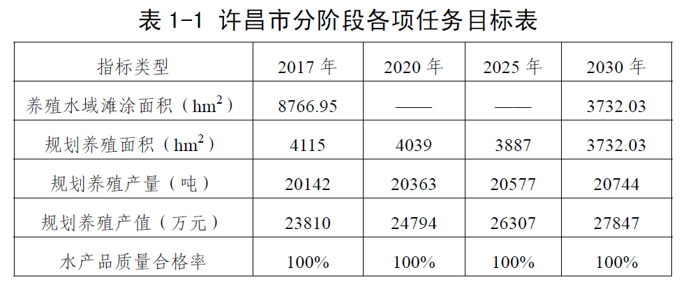 许昌市渔业发展以生态发展、健康发展理念为引领,以提质增效、减量增收、绿色发展、富裕渔民为目标,到2025年,许昌市水产养殖业绿色发展取得明显成效,空间布局明显优化,养殖环境明显改善,转型升级目标基本实现,消费者对优质安全水产品的需求基本满足。到2030年符合绿色发展要求的现代水产养殖产业体系基本建成,养殖尾水治理基本到位,优美养殖水域生态环境基本形成,满足人民对优质安全水产品和优美水域生态环境的需求。