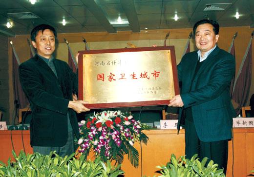 200913,省卫生厅副厅长黄玮代表全国爱卫会向李亚市长颁授了“国家卫生城市”匾牌,省爱卫办副主任单新国宣读了全国爱卫会关于命名许昌市为国家卫生城市的决定。