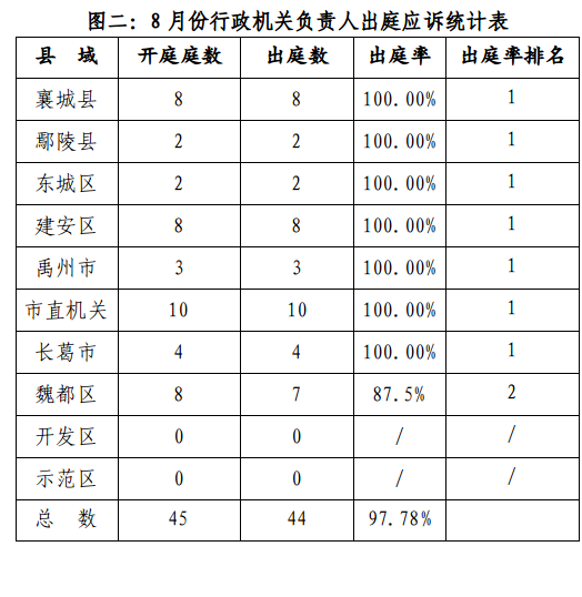 2023年8月,许昌市两级法院开庭审理一审、二审行政案件共45件,出庭44件,行政机关负责人出庭应诉率为97.78%。上述数据中,一审行政案件开庭审理23件,出庭23件,行政机关负责人出庭应诉率为100%;二审行政案件开庭审理22件,出庭21件,行政机关负责人出庭应诉率为94.45%(见图二)。