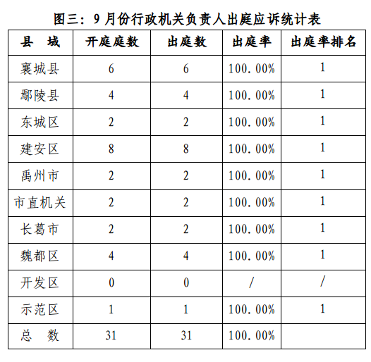 2023年9月,许昌市两级法院开庭审理一审、二审行政案件共31件,出庭31件,行政机关负责人出庭应诉率为100%。上述数据中,一审行政案件开庭审理18件,出庭18件,行政机关负责人出庭应诉率为100%;二审行政案件开庭审理13件,出庭13件,行政机关负责人出庭应诉率为100%(见图三)。