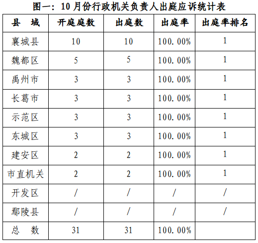 2023年10月,许昌市县两级法院开庭审理一审、二审行政案件共31件,出庭31件,行政机关负责人出庭应诉率为100%。上述数据中,一审行政案件开庭审理19件,出庭19件,行政机关负责人出庭应诉率为100%;二审行政案件开庭审理12件,出庭12件,行政机关负责人出庭应诉率为100%(见图一)。