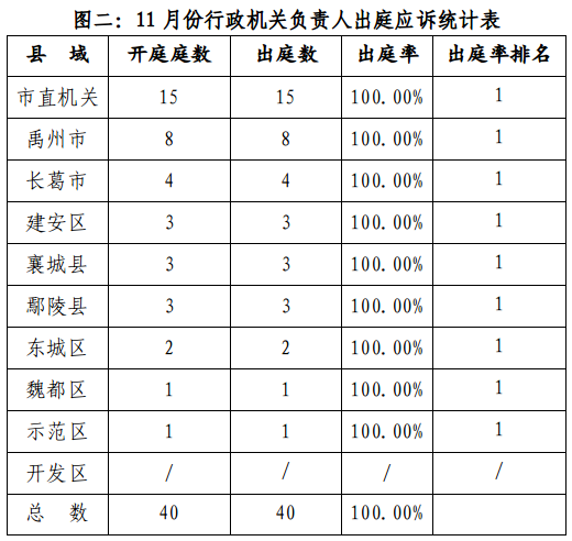2023年11月,许昌市县两级法院开庭审理一审、二审行政案件共40件,出庭40件,行政机关负责人出庭应诉率为100%。上述数据中,一审行政案件开庭审理26件,出庭26件,行政机关负责人出庭应诉率为100%;二审行政案件开庭审理14件,出庭14件,行政机关负责人出庭应诉率为100%(见图二)。