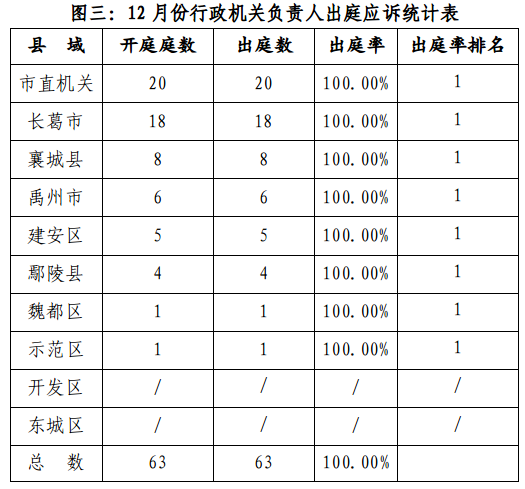 2023年12月,许昌市县两级法院开庭审理一审、二审行政案件共63件,出庭63件,行政机关负责人出庭应诉率为100%。上述数据中,一审行政案件开庭审理49件,出庭49件,行政机关负责人出庭应诉率为100%;二审行政案件开庭审理14件,出庭14件,行政机关负责人出庭应诉率为100%(见图三)。