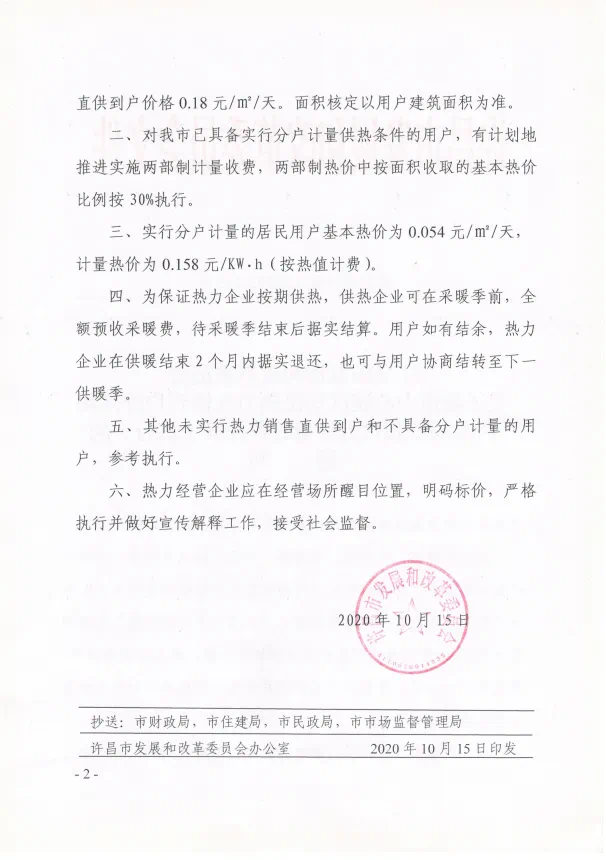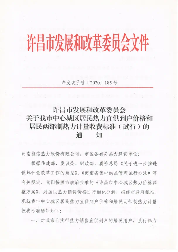 关于我市中心城区居民热力直供到户价格和居民两部制热力计量收费标准(试行)的通知