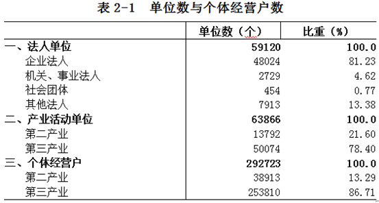 2018年末,全市共有从事第二产业和第三产业活动的法人单位59120个,比2013年末(2013年是第三次全国经济普查年份,下同)增加23728个,增长67.0%;产业活动单位63866个,增加26499个,增长70.9%;个体经营户292723个,增长15.4%(详见表2-1)。