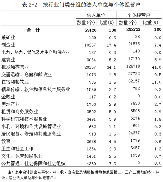 2018年末,在第二产业和第三产业法人单位中,位居前三位的行业是:批发和零售业20157个,占34.1%;制造业10267个,占17.4%;公共管理、社会保障和社会组织4339个,占7.3%。在个体经营户中,位居前三位的行业是:批发和零售业128719个,占44.0%;住宿和餐饮业32157个,占11.0%;交通运输、仓储和邮政业27722个,占9.5%(详见表2-2)。