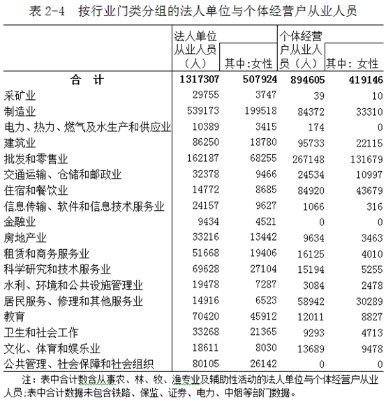 法人单位从业人员中,位居前三位的行业是:制造业53.92万人,占40.9%;批发和零售业16.22万人,占12.3%;建筑业8.63万人,占6.5%。个体经营户从业人员中,位居前三位的行业是:批发和零售业26.71万人,占29.9%;建筑业9.57万人,占10.7%;住宿和餐饮业8.49万人,占9.5%(详见表2-4)。