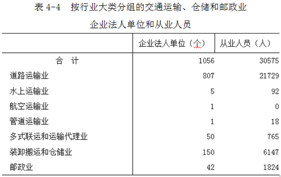 2018年末,全市共有交通运输、仓储和邮政业企业法人单位1056个,从业人员3.1万人,分别比2013年末增长124.7%和39.8%(详见表4-4)。