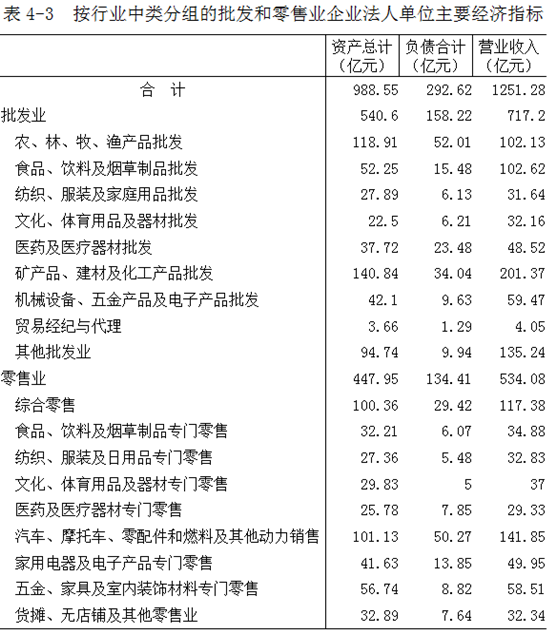 2018年末,批发和零售业企业法人单位资产总计988.55亿元,比2013年末增长 92.9 %。其中,批发业企业法人单位资产总计540.60亿元,零售业企业法人单位资产总计447.95亿元,分别比2013年末增长 67.1 %和137.3 %。负债合计292.62亿元。全年实现营业收入1251.28亿元(详见表4-3)。