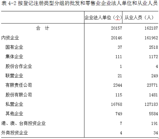 批发和零售业企业法人单位从业人员中,内资企业占99.86%,港、澳、台商投资企业占0.12%,外商投资企业占0.02%(详见表4-2)。