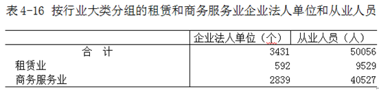 租赁和商务服务业企业法人单位中,租赁业占17.3%,商务服务业占82.7%。在租赁和商务服务业企业法人单位从业人员中,租赁业占19.0%,商务服务业占81.0%(详见表4-16)。