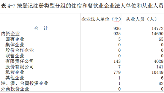 住宿和餐饮业企业法人单位从业人员中,内资企业占99.4%,港、澳、台商投资企业占0.6%,(详见表4-7)。