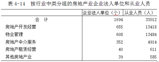 2018年末,全市房地产业企业法人单位的从业人员为33012人,比2013年末增长75.9%。其中,房地产开发经营企业13418人,物业管理企业13484人,房地产中介服务企业4914人,分别比2013年末增长31.5%、99.1%和289.1%(详见表4-14)。