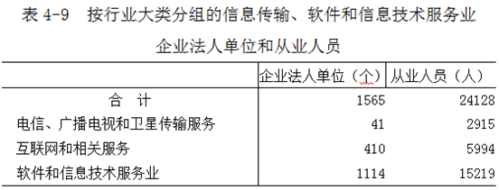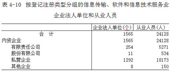 信息传输、软件和信息技术服务业企业法人单位中,内资企业占主导地位(详见表4-10)。