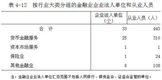 2018年末,全市共有金融业企业法人单位33个,从业人员443人(详见表4-12)。