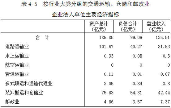 2018年末,交通运输、仓储和邮政业企业法人单位资产总计185.85亿元,比2013年末增长25.9%。负债合计99.09亿元。全年实现营业收入135.51亿元(详见表4-5)。