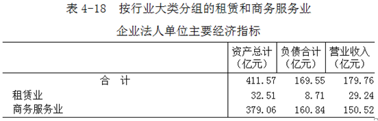 2018年末,租赁和商务服务业企业法人单位资产总计411.57亿元,比2013年末增长185.6%。其中,租赁业企业法人单位资产总计32.51亿元,商务服务业企业法人单位资产总计379.06亿元。负债合计169.55亿元。全年实现营业收入179.76亿元。(详见表4-18)。