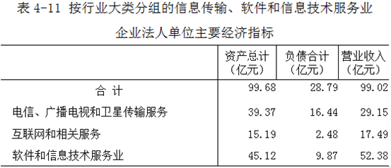 2018年末,信息传输、软件和信息技术服务业企业法人单位资产总计99.68亿元,比2013年末增长174.5%。负债合计28.79亿元。全年实现营业收入99.02亿元(详见表4-11)。