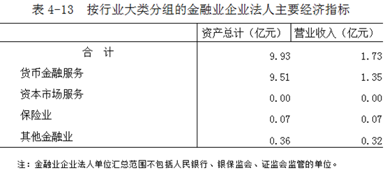 2018年末,金融业企业法人单位资产总计9.93亿元。全年实现营业收入1.73亿元(详见表4-13)。