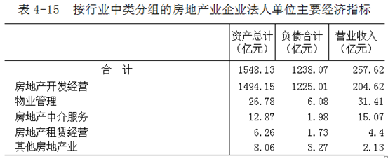 2018年末,全市房地产业企业法人单位的资产总计为1548.13亿元,比2013年末增长207.7%。其中,房地产开发经营企业1494.14亿元,物业管理企业26.78亿元,房地产中介服务企业12.87亿元,分别比2013年末增长202.9%,360.1%和488.4%。负债合计1238.07亿元。全年实现营业收入257.62亿元(详见表4-15)。