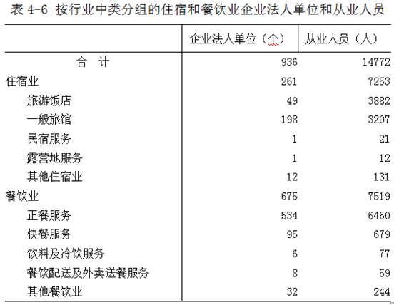 住宿和餐饮业企业法人单位中,住宿业占27.9%,餐饮业占72.1%。住宿和餐饮业企业法人单位从业人员中,住宿业占49.1%,餐饮业占50.9%(详见表4-6)。