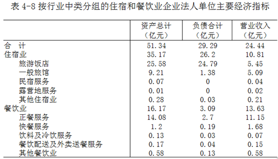 2018年末,住宿和餐饮业企业法人单位资产总计51.34亿元,比2013年末增长 12.2 %。其中,住宿业企业法人单位资产总计35.17亿元,餐饮业企业法人单位资产总计16.17亿元,分别比2013年末增长 10.9 %和15.3%。负债合计29.29亿元。全年实现年营业收入24.44亿元(详见表4-8)。