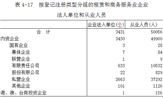 租赁和商务服务业企业法人单位从业人员中,内资企业占99.7%,港、澳、台商投资企业占0.3%(详见表4-17)。