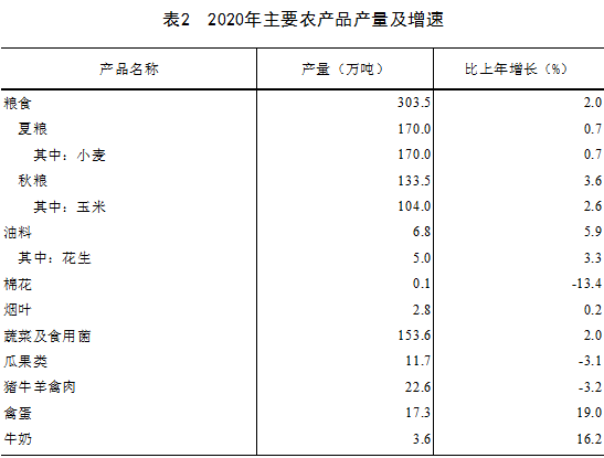 全年粮食产量303.54万吨,比上年增加5.85万吨,增长2.0%。其中,夏粮产量170.04万吨,比上年增加1.24万吨,增长0.7%;秋粮产量133.50万吨,比上年增加4.61万吨,增长3.6%。棉花产量0.07万吨,下降13.4%;烟叶产量2.83万吨,增长0.2%。油料产量6.81万吨,增长5.9%。蔬菜及食用菌产量153.62万吨,增长2.0%。