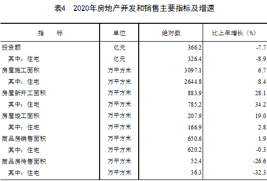 全年房地产开发投资366.2亿元,比上年下降7.7%。其中,住宅投资326.4亿元,下降8.9%;办公楼投资3.4亿元,下降28.4%;商业营业用房投资20.7亿元,下降2.1%。房屋施工面积3097.1万平方米,增长6.7%。房屋新开工面积883.9万平方米,增长28.1%。房屋竣工面积207.9万平方米,增长19.0%。商品房销售面积650.6万平方米,增长1.9%。