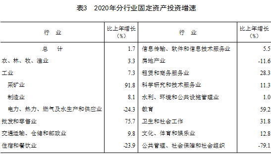 在固定资产投资中,第一产业投资比上年下降2.6%,第二产业投资增长7.3%,第三产业投资下降1.0%。基础设施投资增长1.5%;民间投资下降4.9%;工业投资增长7.3%。