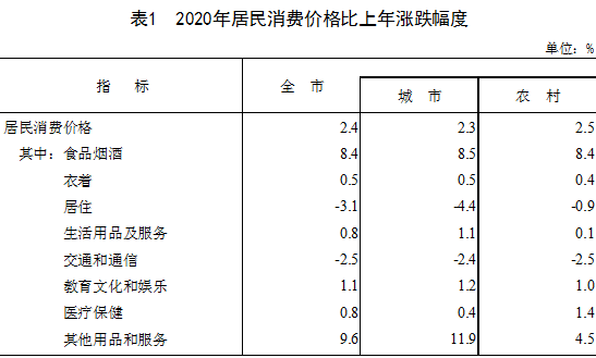 全年居民消费价格比上年上涨2.4%。其中,城市上涨2.3%,农村上涨2.5%。食品烟酒价格上涨8.4%。非食品烟酒价格下降0.4%。服务价格下降0.9%。工业品价格上涨0.3%。消费品价格上涨4.1%。