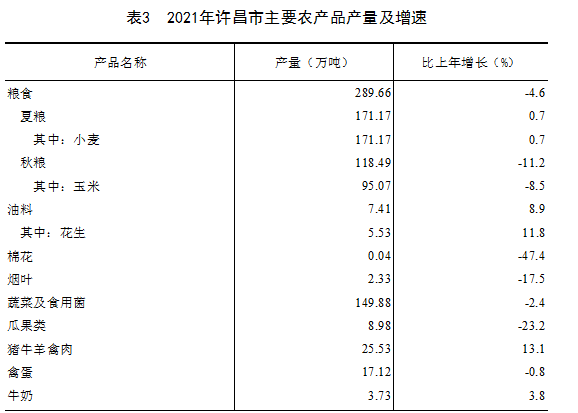 全年粮食产量289.66万吨,比上年下降4.6%。其中,夏粮产量171.17万吨,比上年增长0.7%;秋粮产量118.49万吨,比上年下降11.2%。棉花产量0.04万吨,下降47.4%。烟叶产量2.33万吨,下降17.5%。油料产量7.41万吨,增长8.9%。蔬菜及食用菌产量149.88万吨,下降2.4%。