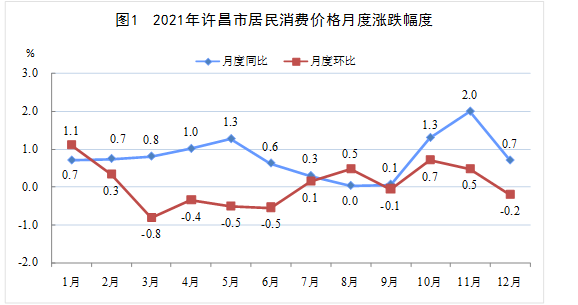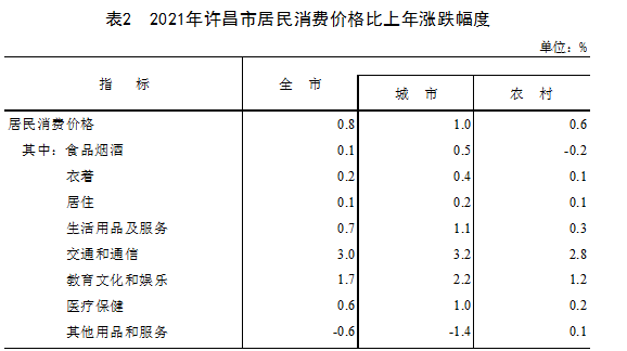 全年居民消费价格比上年上涨0.8%。其中,城市上涨1.0%,农村上涨0.6%。食品烟酒价格上涨0.1%。非食品烟酒价格上涨1.1%。服务价格上涨0.7%。工业品价格上涨1.4%。消费品价格上涨0.8%。