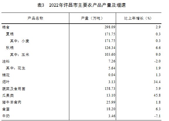 全年全市粮食产量298.09万吨,比上年增长2.9%。其中,夏粮产量171.75万吨,增长0.3%;秋粮产量126.34万吨,增长6.6%。棉花产量0.04万吨,增长1.3%。烟叶产量3.13万吨,增长34.4%。油料产量7.26万吨,下降2.0%。蔬菜及食用菌产量158.73万吨,增长5.9%。