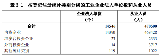 在工业企业法人单位从业人员中,内资企业463428人,占98.5%;港澳台投资企业2333人,占0.5%;外商投资企业3717人,占0.8%(详见表3-1)。