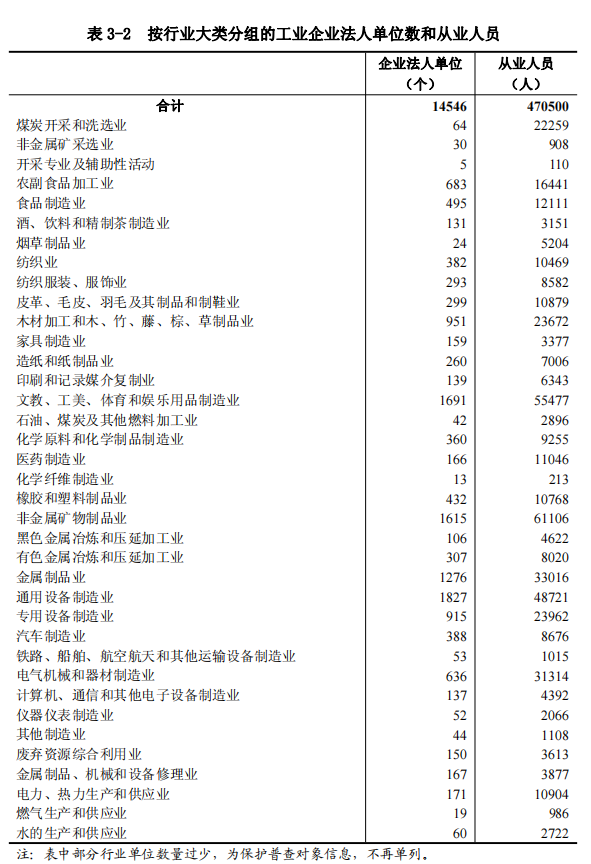 在工业企业法人单位从业人员中,采矿业23490人,制造业432398人,电力、热力、燃气及水生产和供应业14612人,分别占5.0%、91.9%和3.1%。在工业行业大类中,非金属矿物制品业,文教、工美、体育和娱乐用品制造业,通用设备制造业从业人员数位居前三位,分别占13.0%、11.8%和10.4%(详见表3-2)。