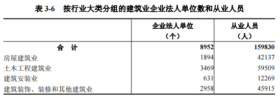 建筑业企业法人单位从业人员中,房屋建筑业占26.4%,土木工程建筑业占37.2%,建筑安装业占7.7%,建筑装饰、装修和其他建筑业占28.7%(详见表3-6)。