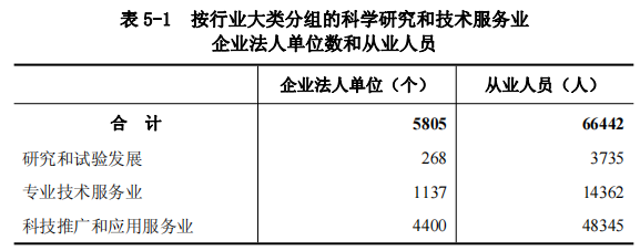 2023年末,全市共有科学研究和技术服务业法人单位5901个,从业人员6.9万人。其中,企业法人单位5805个,从业人员6.6万人(详见表5-1)。