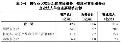 2023年末,全市居民服务、修理和其他服务业企业法人单位资产总计42.2亿元,负债合计10.6亿元。全年实现营业收入51.6亿元(详见表5-4)。