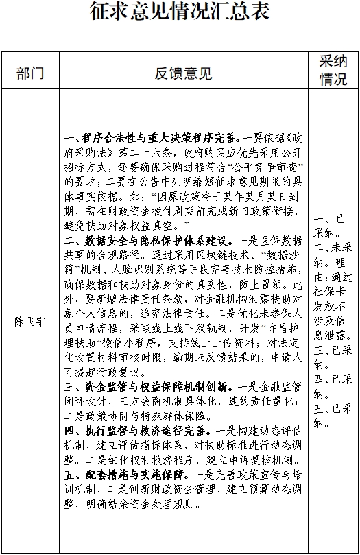 1条意见未被采纳主要原因:此意见在扶助办法中已有明确规定,通过惠民惠农一卡通平台发放不涉及信息泄露。