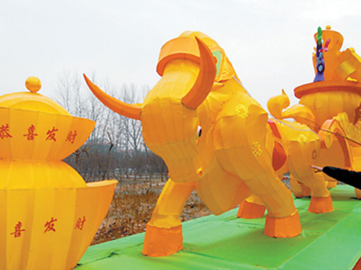 1月18日,来自四川自贡的技术人员正在禹州森林植物园检修已安装好的“奔牛”花灯。据了解,春节期间,禹州森林植物园将举办第二届禹州灯会,届时,吴桥“八大怪”、安塞腰鼓、传统戏剧、歌舞、杂技及著名风味小吃等将进园参加节庆活动。