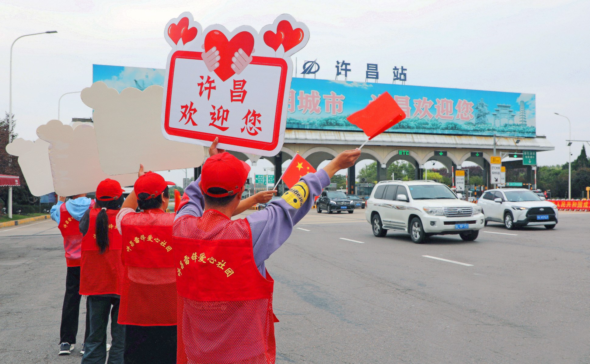 10月1日,许昌雷锋爱心社团志愿者在京港澳高速公路许昌下站口挥舞小红旗迎接外地游客。国庆假期,慕名赴许昌旅游购物的游客大增。连日来,该社团志愿者自发组织爱心车辆免费接送游客,并在我市各大景点开展志愿服务活动,为游客提供帮助。谭宜姝 摄