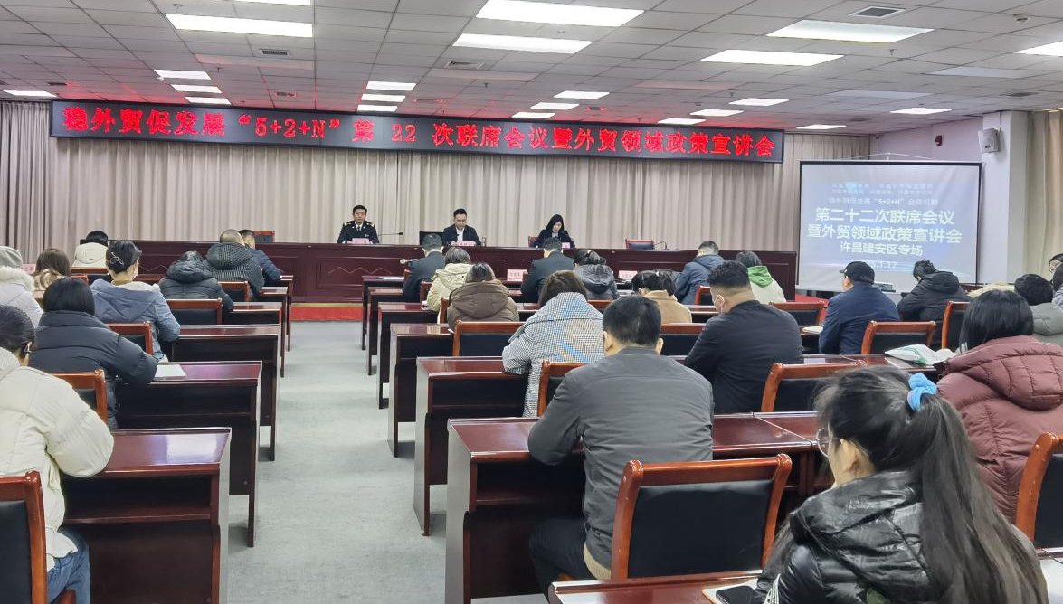 为进一步推动优化营商环境政策落地见效,提升为企服务效能,1月17日上午,市商务局联合许昌海关、市税务局、市外汇局赴建安区召开稳外贸促发展“5+2+N”第22次联席会议暨外贸领域政策宣讲会,100多家企业参会。