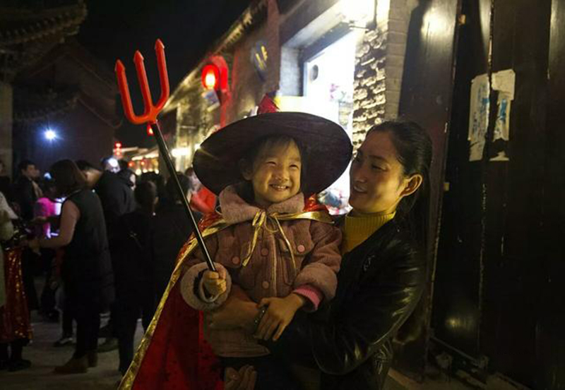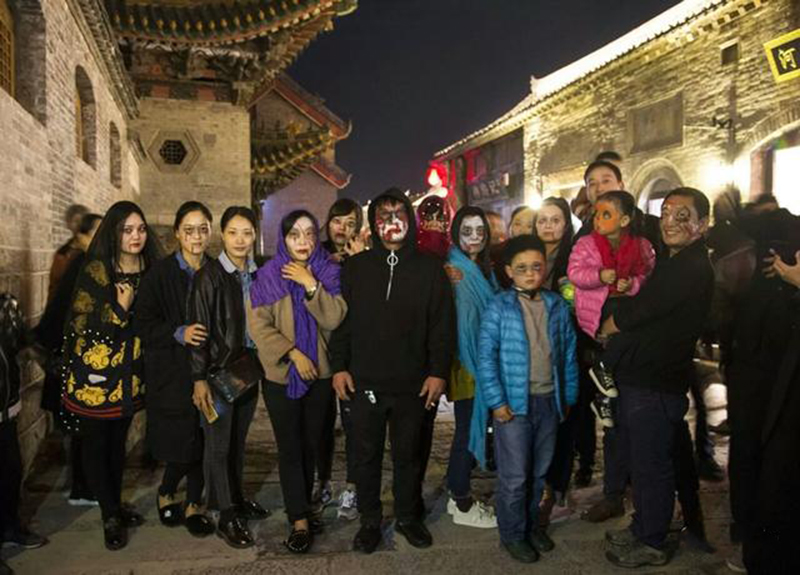 10月31日当晚,随着夜幕悄悄降临,神垕古镇万圣节游老街活动慢慢拉开了帷幕,老街上的人渐渐多了起来。他们身着怪异装扮,或化着鬼怪面妆,或带着骷髅面具,手持各种道具,在老街穿行,逢人便做鬼脸。