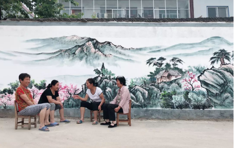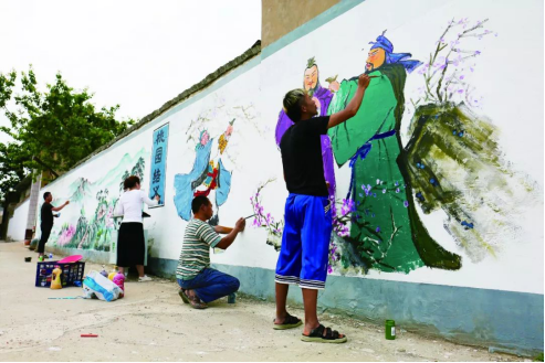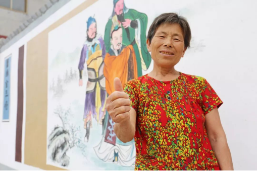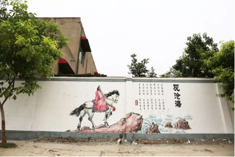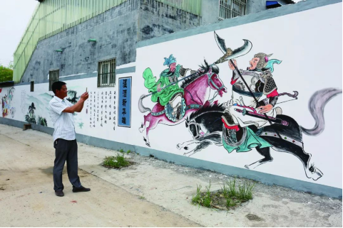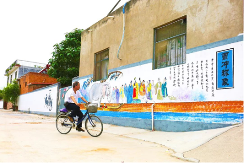 “就像给俺村画了画妆,村子美了,俺们心里也可美。”村民毛玉娥家的外墙正位于环村水系的显眼位置,原先的灰色水泥墙被粉刷一新,长约40米长的外墙上,画着“桃园三结义”的场景——桃花繁密,盛开于林;不远处,青山绿水,巍峨壮观。刘备、关羽、张飞举酒结义,对天盟誓,期许着未来建功立事,共同实现人生的美好理想。