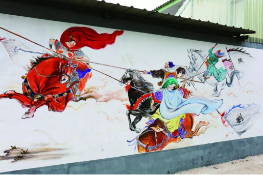 不同于往常手绘的文化墙,老吴营文化墙绘制精细,手法多样且巧妙,既有国画技法,又有工笔画技法,还有油画技法,择三国文化之经典,扬不同画师技艺之所长,加之以艺术创作之灵感,造就了如今老吴营社区千余平方米的文化墙。