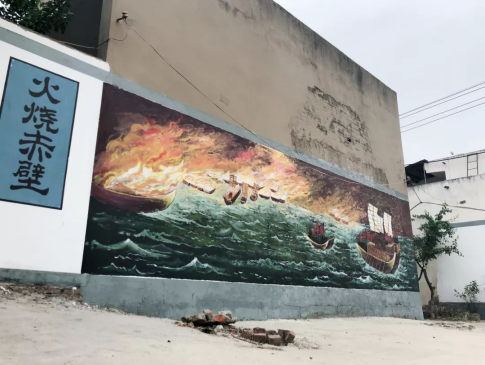 不只是一面或几面三国元素的文化墙,沿着老吴营环村水系北侧,家家户户墙上都画上了三国文化故事。这边是“桃园三结义”,那边是“煮酒论英雄”。既有“曹冲称象”的热闹场面,又有“火烧赤壁”的激烈场景。你家墙上画的是悠悠竹林,我家墙上画的是泉水叮咚。家家户户的文化墙不尽相同,各有特色,互为呼应。