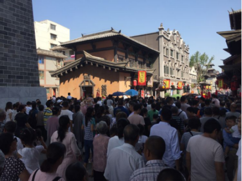 演出结束的魏王曹操顿时被潮水一般的游客包围了……潮水般的游客涌向曹魏古城南大街。