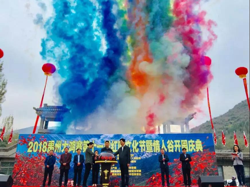 10月20日,大鸿寨景区人潮涌动,禹州大鸿寨第十一届红叶文化节暨情人谷开园庆典在此隆重举行。许昌市旅游局副局长康松朝、禹州市委常委宣传部长李益民、禹州市副市长牛艳伟共同按下红叶文化节启动球,禹州市政府办机要室主任王盼攀、禹州市旅游局局长李志领、鸠山镇镇长朱海鹏等领导出席开幕式。