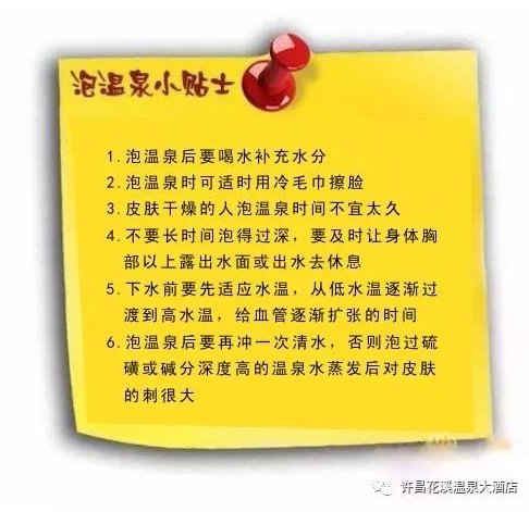 泡温泉时,要多补水。 泡温泉前,我们应该先喝两三杯温开水。因为在浸泡中人的皮肤毛孔会全部打开,喝水是为了利于我们排汗,同时也是为了防止排汗引起的脱水。